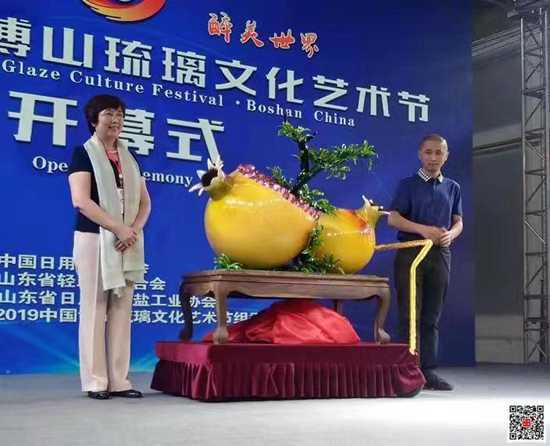 開幕式上,孟令彥、鄭舞虹、畢榮青、王樹槐、王濟眾、劉忠遠共同啟動2019中國博山琉璃文化藝術(shù)節(jié)。中國日用玻璃協(xié)會向中國玻璃藝術(shù)大師孫奉柱授予“中國琉璃葫蘆孫”榮譽稱號;發(fā)布了2019中國博山琉璃文化藝術(shù)節(jié)標志作品——世界最大的琉璃石榴;介紹了故宮與博山琉璃合作情況;發(fā)布了國家文化出口基地成果;淄博美陶瓷器有限公司與中科建集團山家文旅(淄博)有限公司簽約;淄博愛美琉璃制造有限公司、淄博康乾琉璃藝術(shù)品制造有限公司與香港藝思公司聯(lián)合成立淄博博思琉璃制品有限公司(琉璃研發(fā)設(shè)計中心)揭牌;授權(quán)博山區(qū)有代表性的琉璃企業(yè)使用“博山琉璃”地理標志。