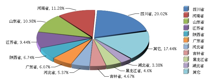 2014年度全國玻璃包裝容器制造行業(yè)主營業(yè)務(wù)收入較去年同期提升9.61%。其中四川、河南、山東三省位列三甲,四川省的主營業(yè)務(wù)收入占全國比重達(dá)到五分之一,河南、山東也都超過十分之一。其他省份中,江蘇、陜西、廣東、河北排名較高。